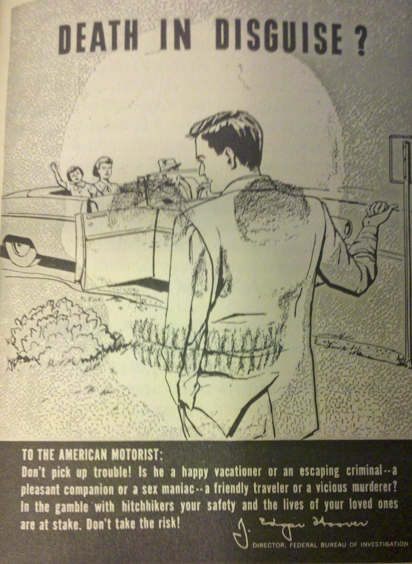 J. Edgar Hoover and the FBI warned motorists against picking up hitchhikers in this anti-hitchhiking poster. “Is he a pleasant companion or a sex maniac?”